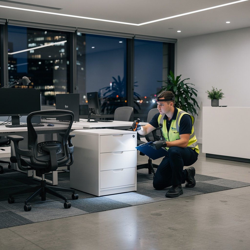 Monthly visits scheduled around your office calendar. Written service report after every visit — building a documented pest control history for building management, tenancy compliance, and ISO facility maintenance requirements. Emergency callout available for active pest sightings between scheduled visits.